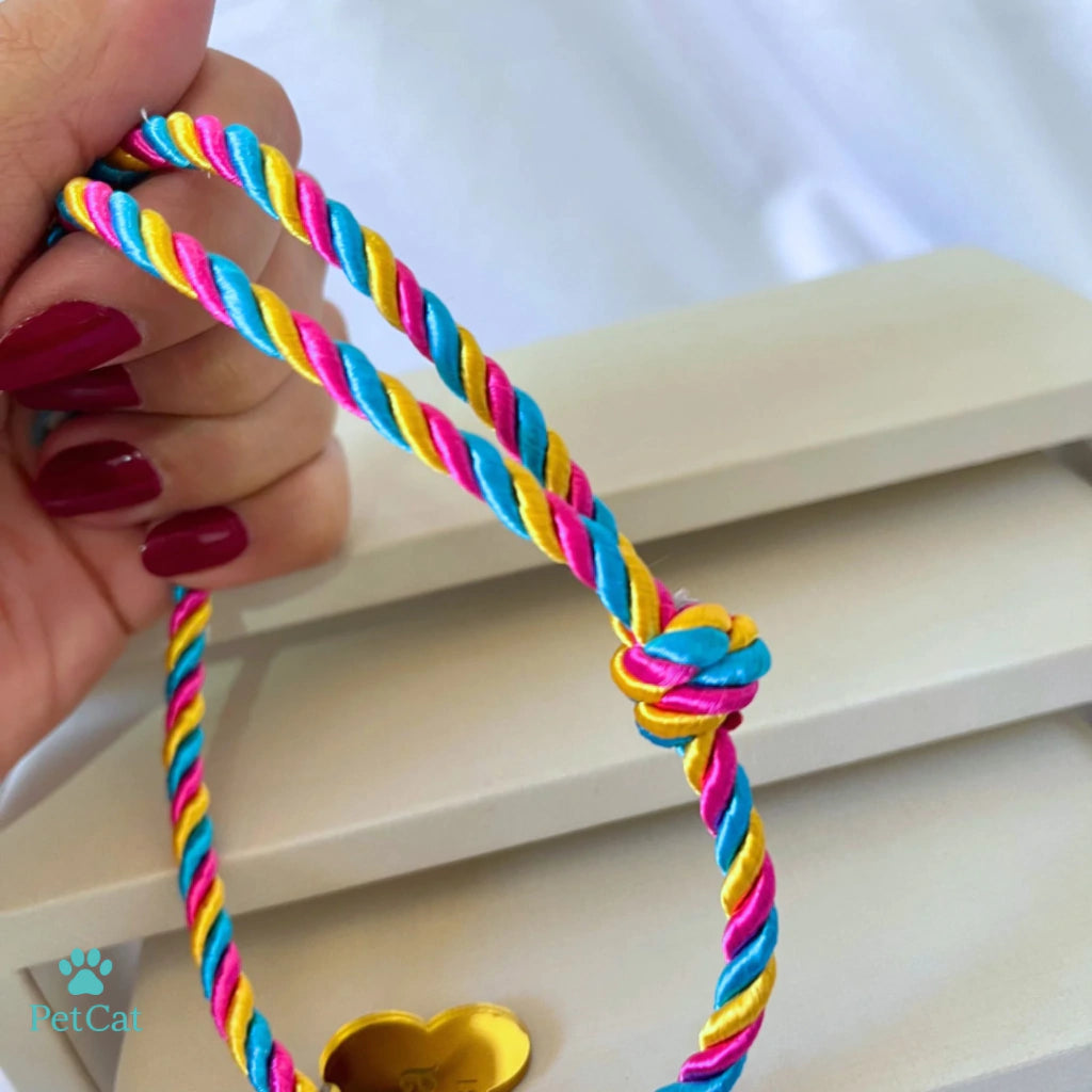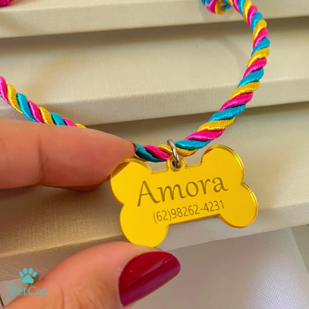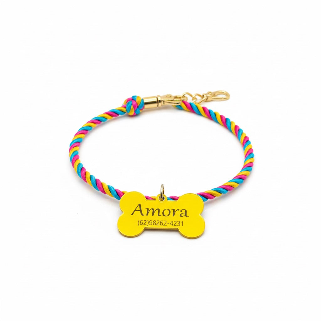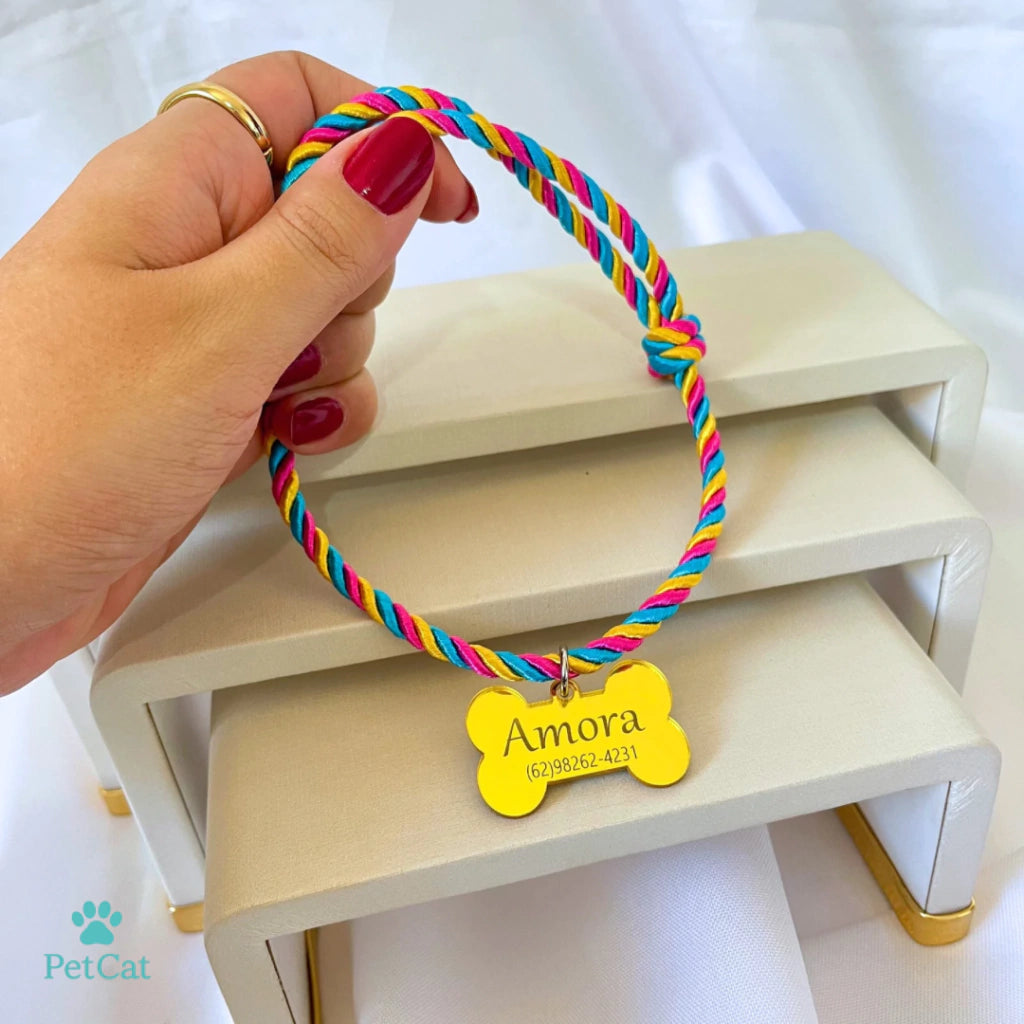 A Coleira Candy Fun é perfeita para os pets mais alegres, estilosos e cheios de personalidade! Com um mix encantador de cores vibrantes e acabamento trançado macio, ela transforma segurança em moda pet. O pingente dourado espelhado personalizado em formato de ossinho completa o visual com elegância.